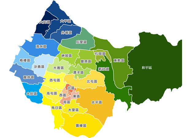 中區/東區/西區/南區/北區/西屯區/南屯區/北屯區/豐原區/大里區/太平區/東勢區/沙鹿區/梧棲區/清水區/大甲區/霧峰區/烏日區/后里區/石岡區/新社區/潭子區/大雅區/神岡區/大肚區/龍井區/大安區/和平區/外埔區..